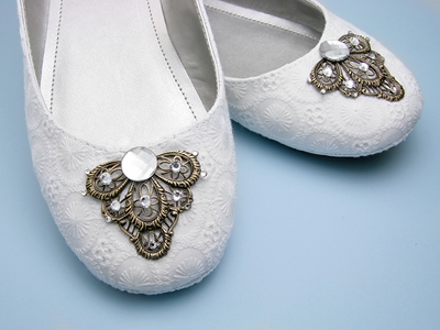To match the vintage style of the gown, we also launched a fantastic bridal footwear idea called Simply Nouveau. These shoes are embellished with antique brass and SWAROVSKI ELEMENTS crystal to produce an elegant look that will have people thinking you dropped some serious cash on them. No one needs to know the actual cost to create this look is less than $27.00!